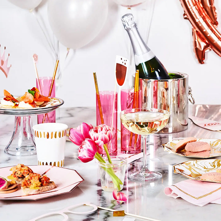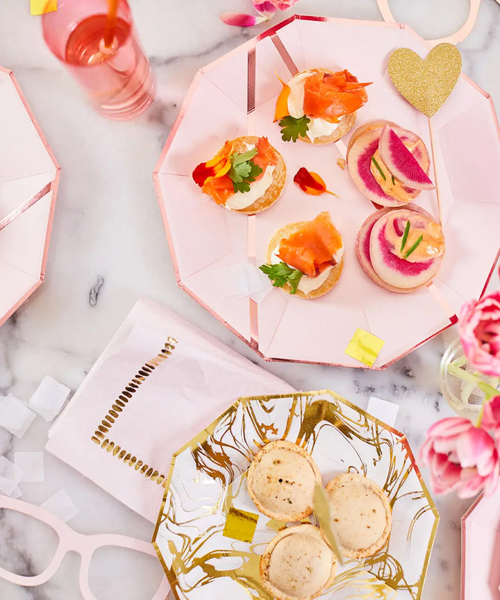 Feminine, refined, and bound to have your guests ooh-ing and aah-ing, these pink plates are cut through with delicate gold lines for modern, understated elegance.