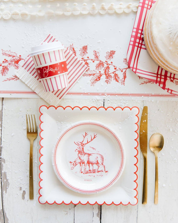 Set a merry table this holiday season with these scalloped dinner plates. The classic red and light cream colour scheme pulls together any Christmas party theme and sets an elegant backdrop for your festive tablescape. The best part of these plates is that there is no washing up after the party, so you are sure to be in bed by the time Santa arrives!