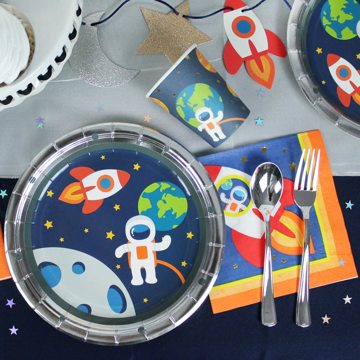These plates are perfect for outer space themed party. Featuring gold foil stars the napkins are illustrated with bright colors.