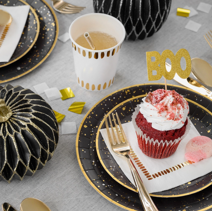 Brighten up your starry night soirees with our celestial gold-rimmed large plates. Featuring a spectacular mix of gold and silver on a black backdrop. They add a heavenly touch to any event. Includes 10 plates.